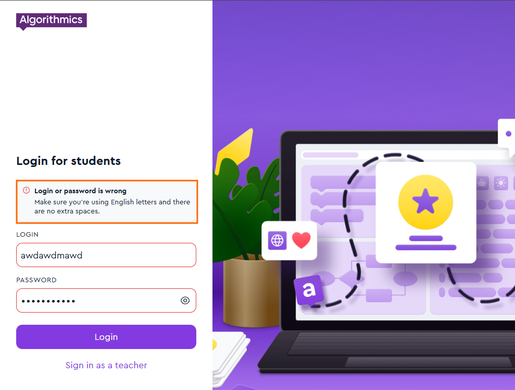 Sometimes, when trying to log in to the student platform https://learn.alg.academy/login, you may see a message saying that the data is incorrect.