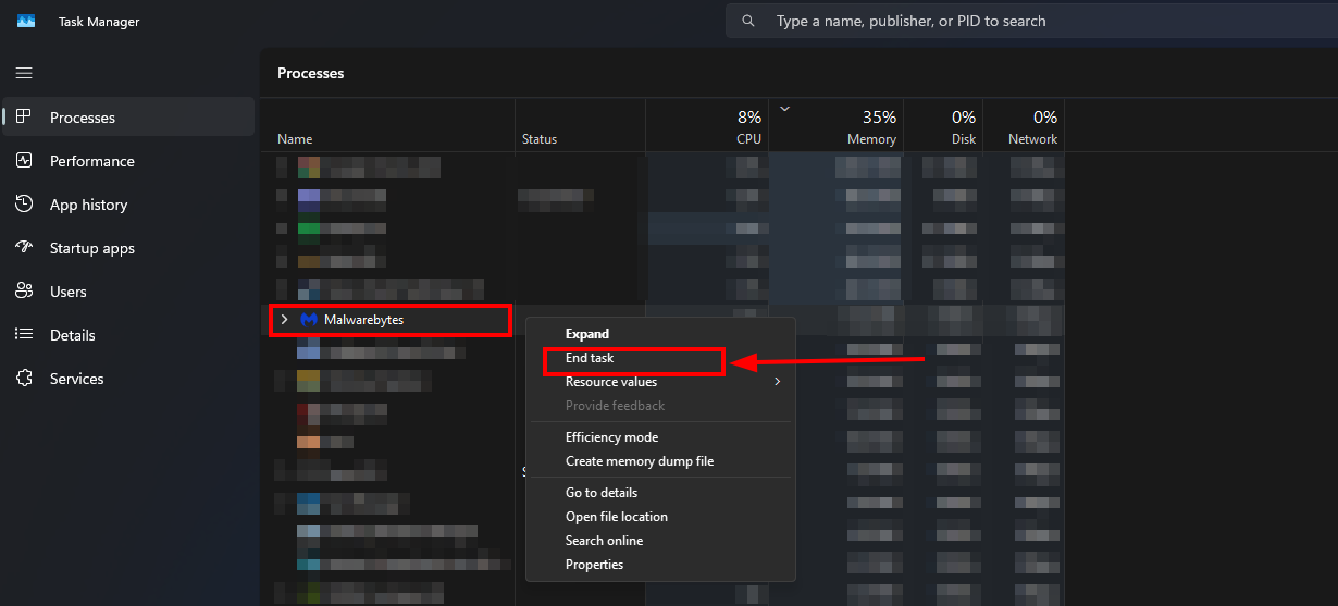 Find the antivirus in the list of processes, right-click on the antivirus and select "End task";