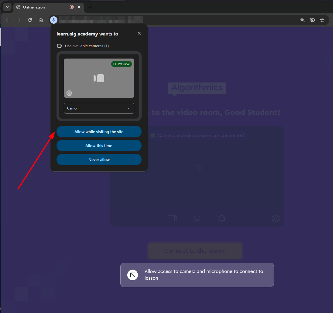 When you connect to the online room for the first time, the browser requests access to the microphone and camera. You must click "Allow while visiting the site".