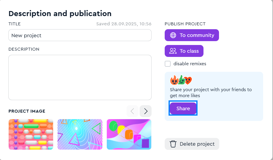 Also, in this window, you can edit the project and change its name, description, and preview.