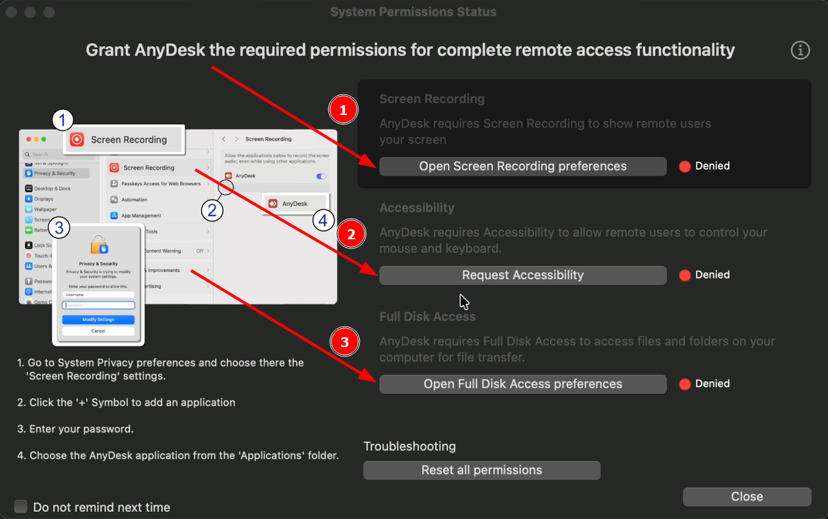 For AnyDesk to work correctly on macOS, the application must be granted all necessary permissions.