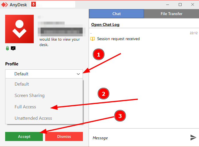 To use AnyDesk, you need to provide your Address to the support specialist. After the request is received, configure the access profile for the agent by granting full access, as shown in the screenshot. This is necessary so that technical support can fully use the device. After configuring the profile, click the green accept button.