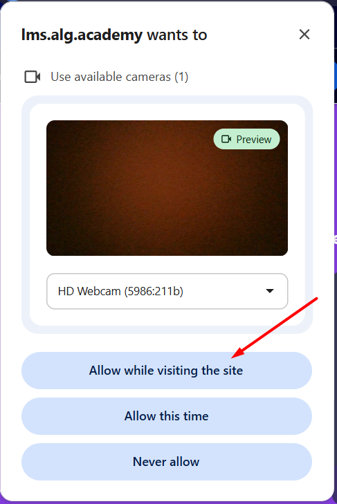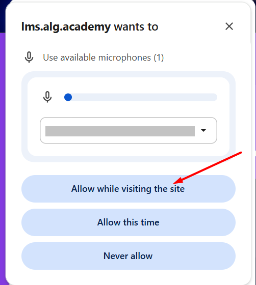 When you first join an online room, the browser will request access to your microphone and camera — be sure to click “Allow while visiting the site”.