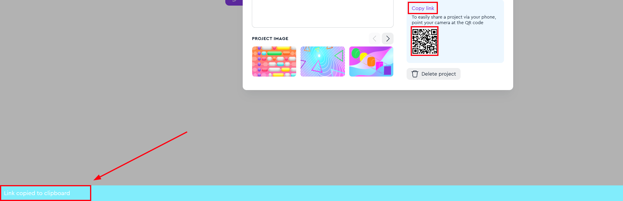 Después de hacer clic en el botón "Compartir", se copiará el enlace del proyecto. Verás un mensaje emergente que dice "Enlace copiado al portapapeles".