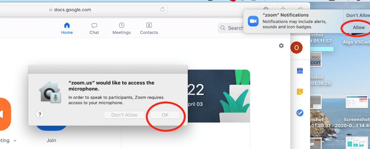 SOLO PARA macOS: Después de iniciar sesión, Zoom solicitará acceso a tu micrófono, cámara y notificaciones. Concede todos los permisos solicitados.