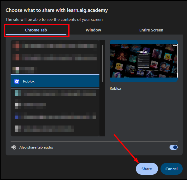 Una pestaña específica del navegador: seleccione "Pestaña de Chrome", haga clic en la pestaña deseada y luego pulse "Compartir".
